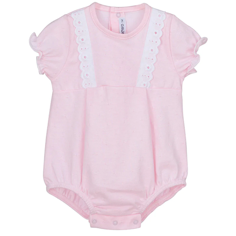 Bombacho de bebé con manga corta, tejido 100% algodón, estampado con microdetalles, decorado con olanes a contraste en la parte superior. Broches de presión en en la parte posterior y entrepierna para facilitar el cambio de pañal.