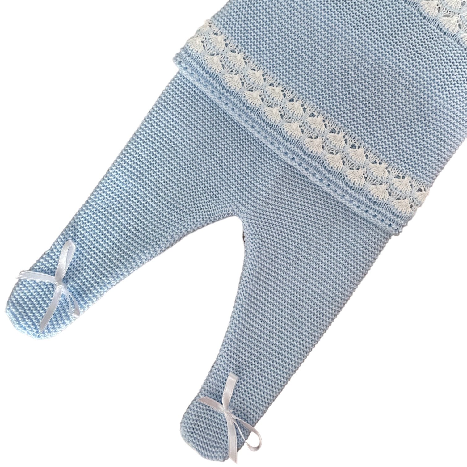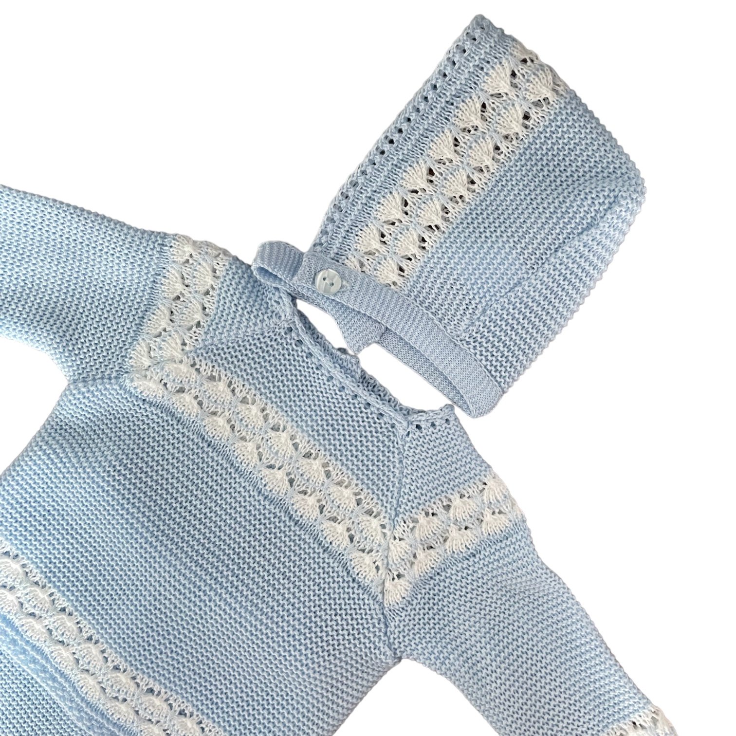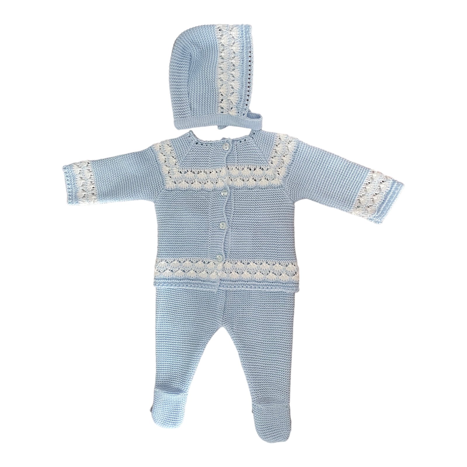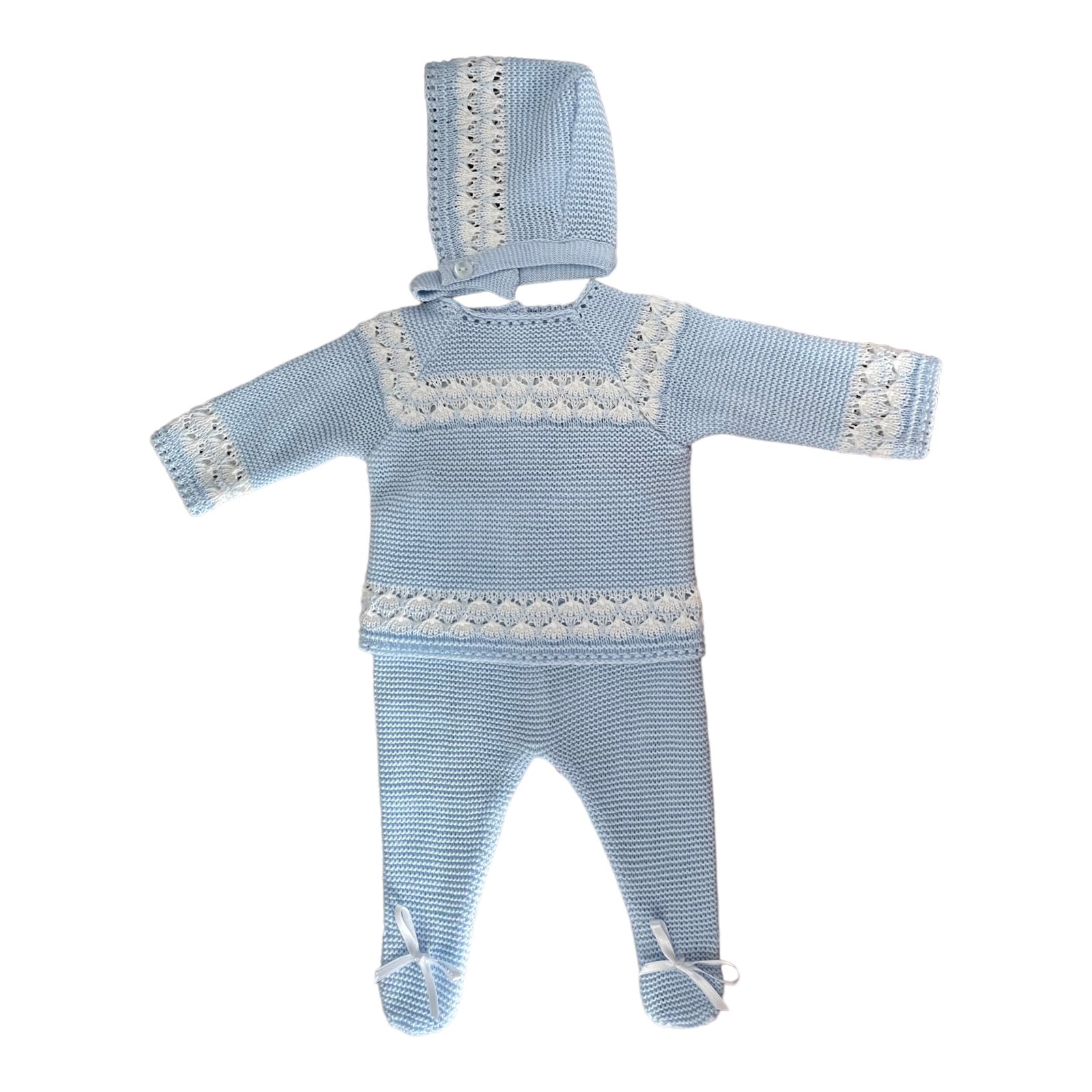 Conjunto para bebé formado por tres piezas: suéter, pantalón y capota. Suéter con cuello cuadrado, bajo y mangas con adorno de greca calada a juego con la capota. Pantalón largo de punto liso con pie cubierto y lazada de raso al tono. Diseñado y fabricado en España.