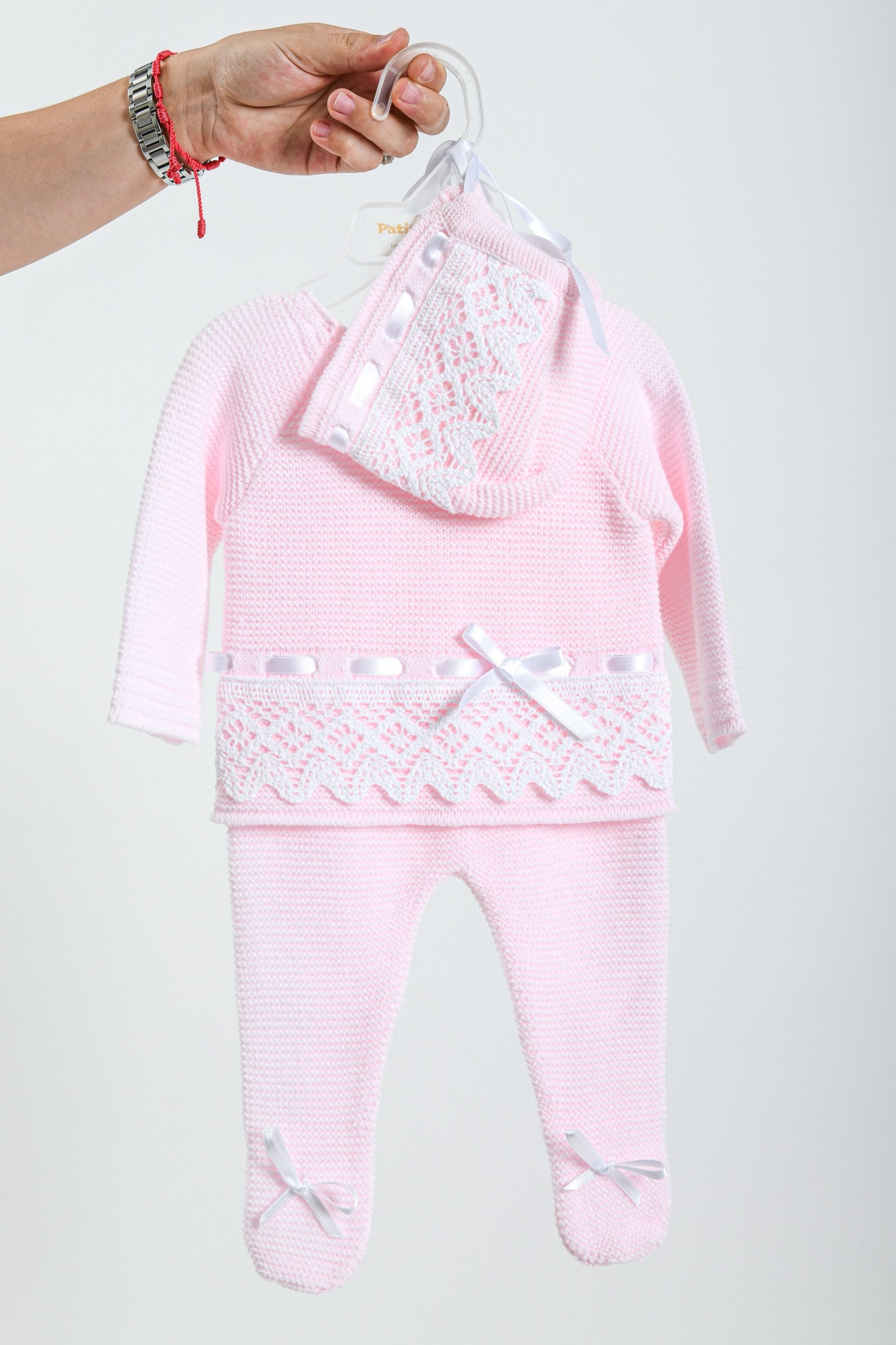 Conjunto tres piezas en tejido de punto en color rosa, suéter con cuello cuadrado, manga larga, detalles de encaje a contraste al frente con lazada y en capota. Pantalón con cintura elástica y piecitos cubiertos con lazada de raso al tono. Diseñado y fabricado en España