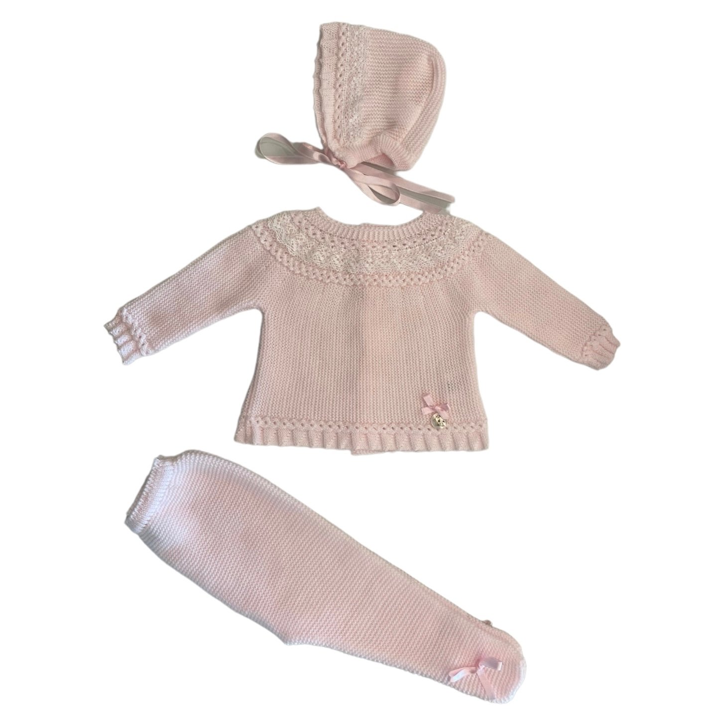 Conjunto para bebé de punto en color rosa formado por tres piezas: suéter, pantalón y capota. Suéter con cuello redondo adornado con encaje y detalle a juego con la cintura y capota. Pantalón largo de punto liso con pie cubierto con lazada de raso al tono. Diseñado y fabricado en España.